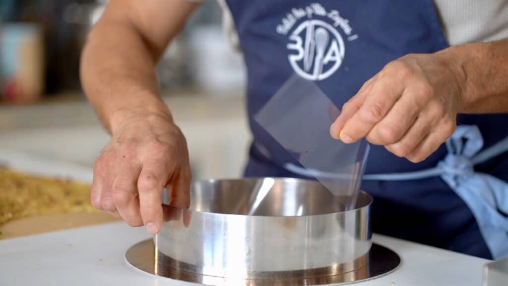- Carefully insert the first pistachio joconde disc in each cake ring that are lined with collar acetate.