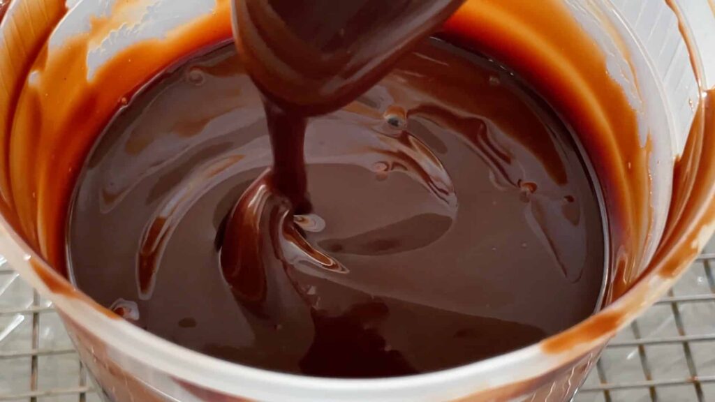 - Make a day ahead. Soak gelatin in cold water to soften, and drain. In a small saucepan, bring to boil water and sugar for 2 minutes. Add cocoa powder, and hot heavy cream, and mix. Bring to a quick boil; remove from the heat, and transfer into a clean container. Add gelatin and blend well keeping the nozzle down. Tap over the counter to remove excess air bubbles and sieve. Chill overnight.