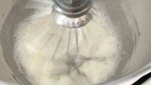 - In the stand mixer fitted with the whisk attachment, start to beat room temp egg whites with fine sugar and cream of tartar on medium speed; keep on foamy stage.