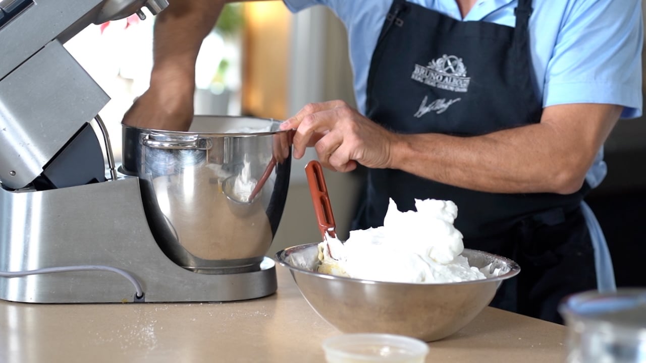 - Beat egg whites along with cream of tartar and a third of the sugar on medium speed. When ready, set mixer speed to high and beat egg whites to stiff peaks adding remaining sugar gradually.