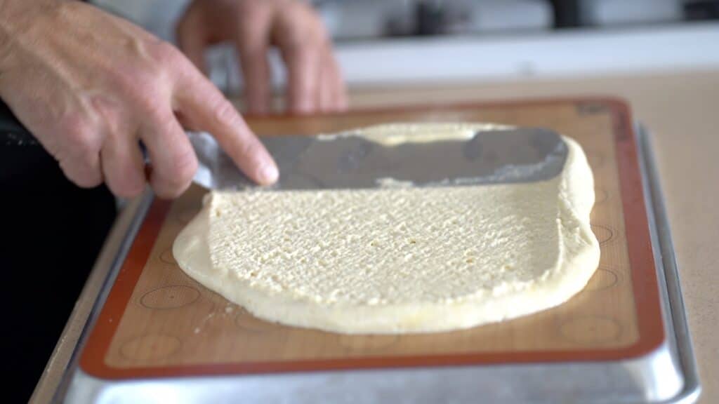 - Using an offset spatula, spread the batter into a thin, uniform layer, making sure your joconde biscuit ends up with an even thickness from edge to edge.