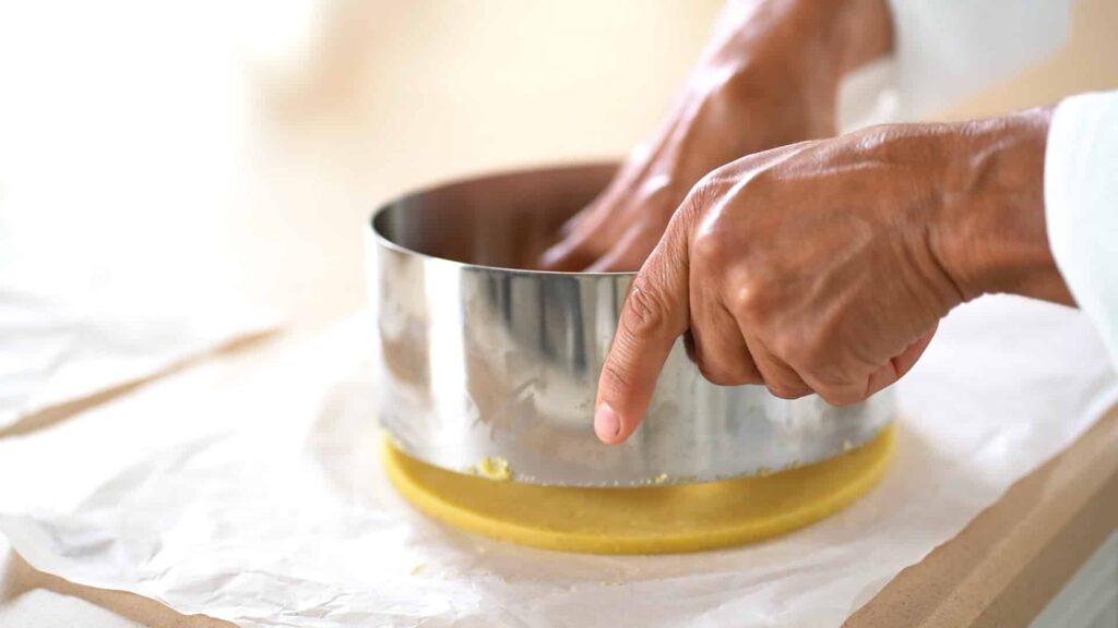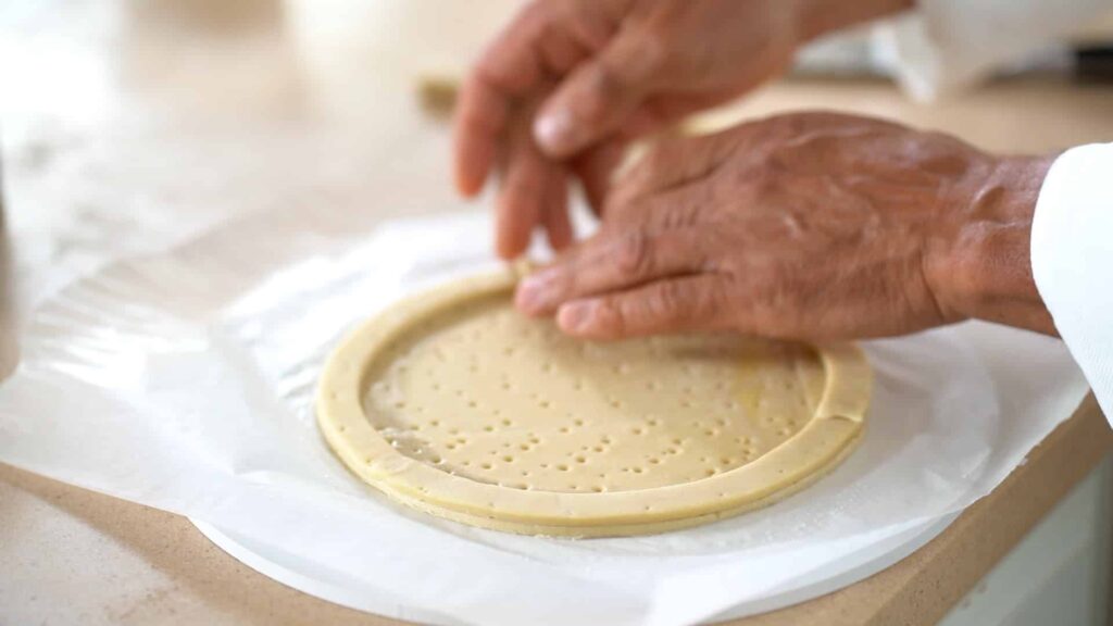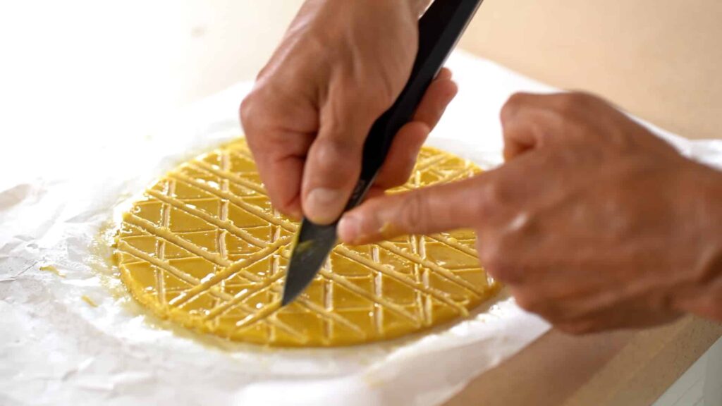 - Meanwhile, roll out sablé breton into a 0.24 inch/6 mm thick sheet (make it twice thicker than the puff pastry disk) and freeze for 20 minutes. Cut out a 9 inch/23 cm diameter disk, and refrigerate until ready to score.