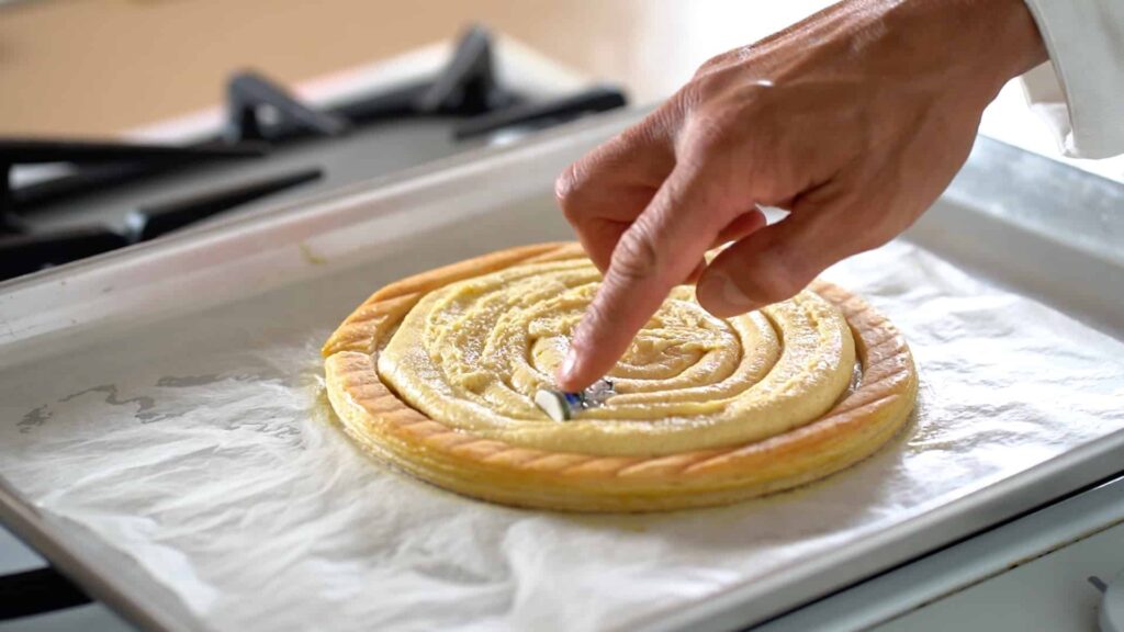 - Preheat oven to 375ºF190ºC. Pre-bake puff pastry for 25 minutes covered with parchment and an upside down cooling rack. Remove from the oven and egg wash sides. Gently deflate the inside of the pastry. Pipe out almond cream, and place a trinket if desired. Bake for an additional 40 minutes.