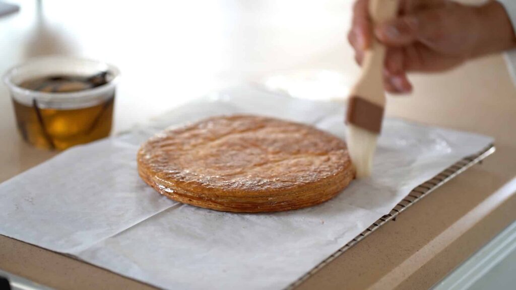 - Remove pastry from the oven. To get a sheen finish, brush out hot pastry sides with some simple syrup. Top with parchment and flip over a cooling rack to rest upside down; it ensures an even result. Once at room temperature, flip back on and set aside.