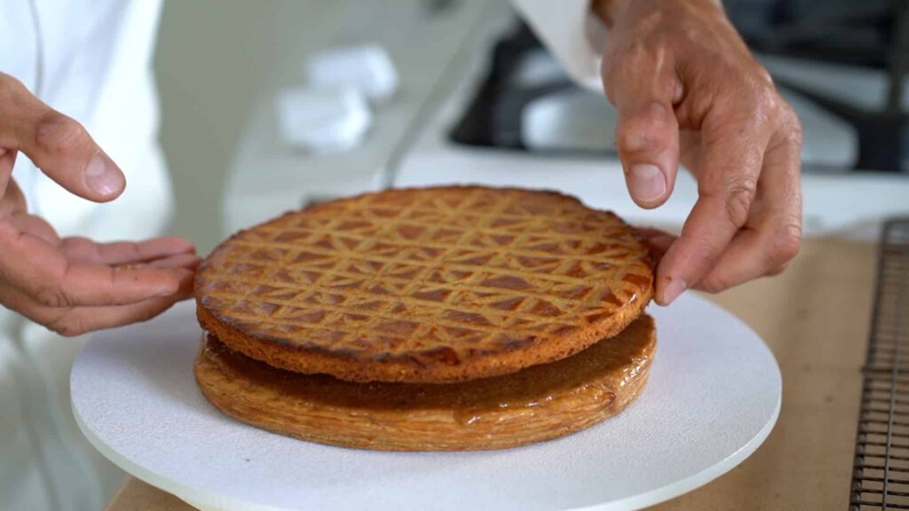 - Spread a thin layer of praliné or orange marmalade on top of the pastry and enclose with the sablé breton. King cake is best enjoyed freshly made and sightly warm or at room temperature.