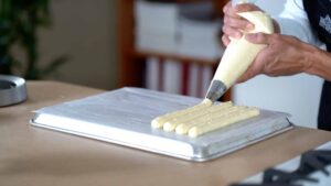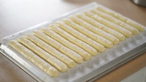 - Bake ladyfingers for 15-18 minutes. Once baked, slide over the countertop to cool.