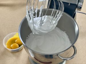 - To begin, start by drawing a 16X8.5-inch/40X21cm rectangle on parchment paper. This will serve as your guide when preparing the cake. Next, lightly oil a baking tray and place the parchment paper on the tray, making sure to position it upside down to avoid direct contact between the ink and the food. Now, it's time to prepare the dry ingredients. Sift the flour with baking powder and set it aside. This step will help ensure that the dry ingredients are well combined and free of any lumps. In a stand mixer fitted with the whisk attachment, start by beating the egg whites with cream of tartar and a portion of the sugar on medium speed. It's essential to allow the egg whites to incorporate as much air as possible before transitioning into a meringue. While the egg whites are beating, preheat your oven to 350ºF/180ºC and gradually increase the mixer speed. Continue beating the egg whites until stiff peaks form, gradually adding the remaining sugar to the mixture. Once the meringue is ready, reduce the mixer speed and add the egg yolks and vanilla extract. Mix until just incorporated, being careful not to overmix. Finally, stop the mixer and gently fold in the sifted flour using a spider skimmer. This technique will help the starch incorporate quickly while preventing the mixture from deflating too much.