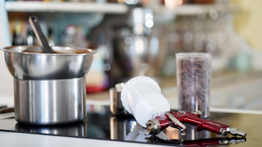 - If you prefer a velvety finish, you can use an edible cocoa butter base velvet spray on the cake and chocolate lace. Click here to learn the secret to achieving a chocolate velvet effect on cakes or a mirror sheen on chocolate bonbons.