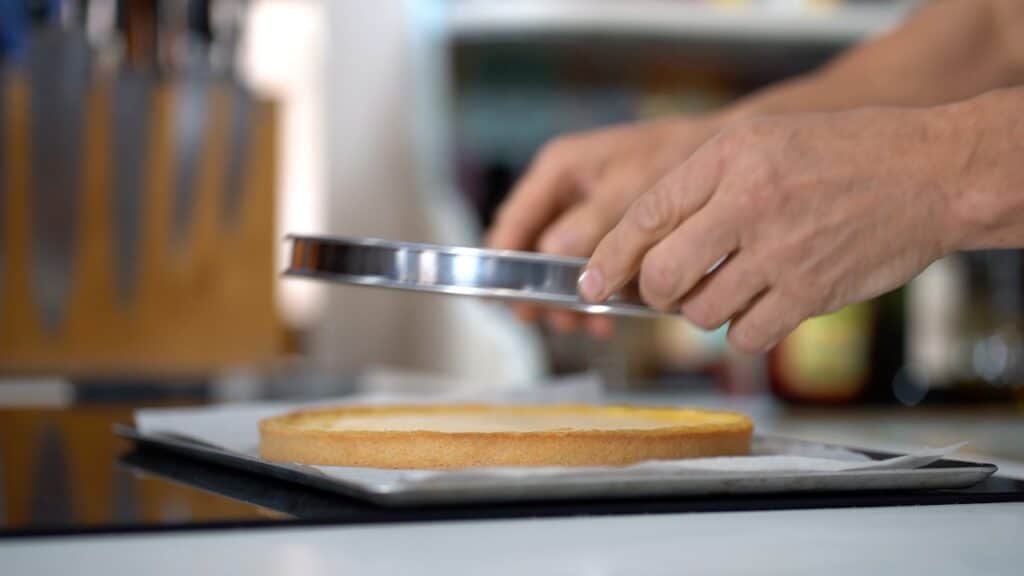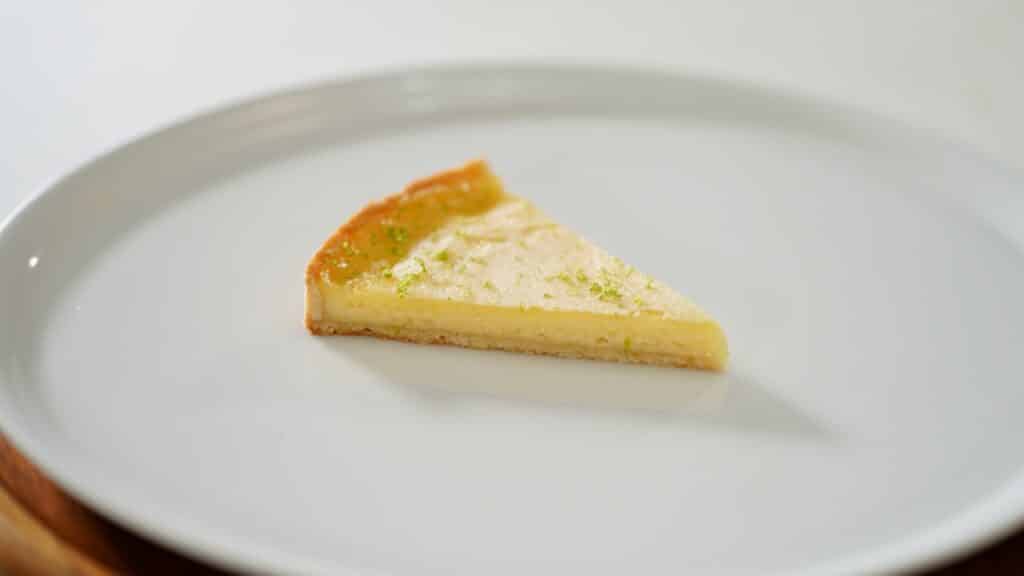 - Bake lemon pie for 20 minutes at 300ºF/150ºC. Turn off oven, and leave the pie inside the oven for 10 minutes more until set but slightly wobbly in the center. Let cool and remove the tart ring.