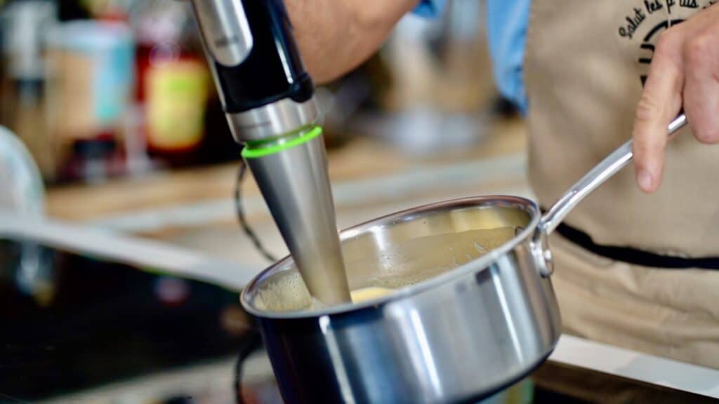 - Give a gentle mix with the immersion blender; set aside.