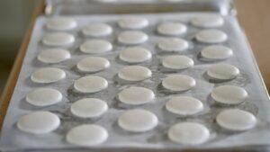- Pipe out 120 macarons. Tap baking tray over the counter a couple times (it removes unwanted air bubbles and it evens shells out). Leave macarons to dry out for at least 30 minutes; a thin film will form allowing macarons to get their feet. Baked macaron shells should measure ≈1.7 inch/4.3 cm in diameter.