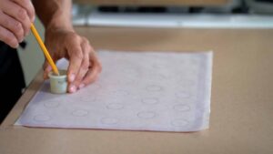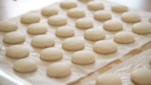 - In professional kitchens, macarons are baked in batches using powerful fan ovens. At home, bake one tray at a time. Macarons can be piped out onto baking mat or parchment paper. Though parchment paper offers more consistent results if using conventional/baking position oven. If using fan oven, both silicone baking mat and parchment work. If using parchment paper, draw 30 number – 1.2 inch/3 cm circles. Make 4X30 = 120 ea. Flip parchment before using so the ink is never in contact with the food. Lightly greased baking tray and parchments with oil or cooking spray. Wipe out excess fat with paper towel.