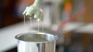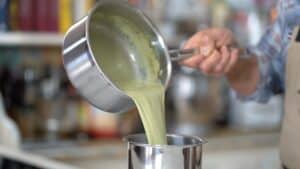 - In a narrow and tall container, add the chopped white chocolate. Pour in the hot matcha liquid and let sit for a couple of minutes.