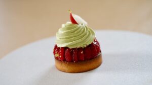 Imagine a delicate tart shell filled with a creamy matcha custard that's been gently infused with passion fruit, then topped with fresh raspberries creating a harmonious, multi-dimensional dessert.