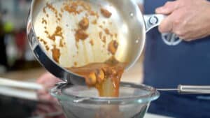 - Strain the reduced mushroom mixture through a fine-mesh sieve, firmly pressing on the solids to extract all the liquid.