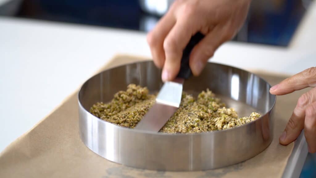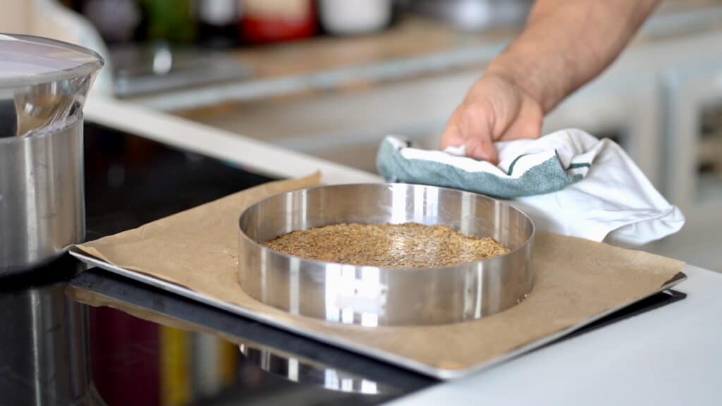 - Place cake ring onto baking tray lined with parchment. Use the bottom of a glass or a flat measuring cup or an offset spatula to press the granola mixture firmly into an even layer.
