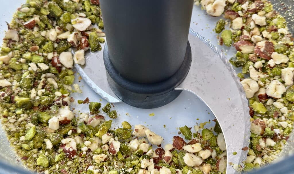 - Melt butter, honey and corn syrup together (do not boil); set aside. In the food processor, crush hazelnuts and pistachios.