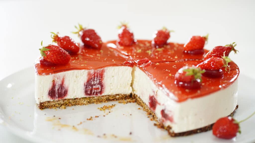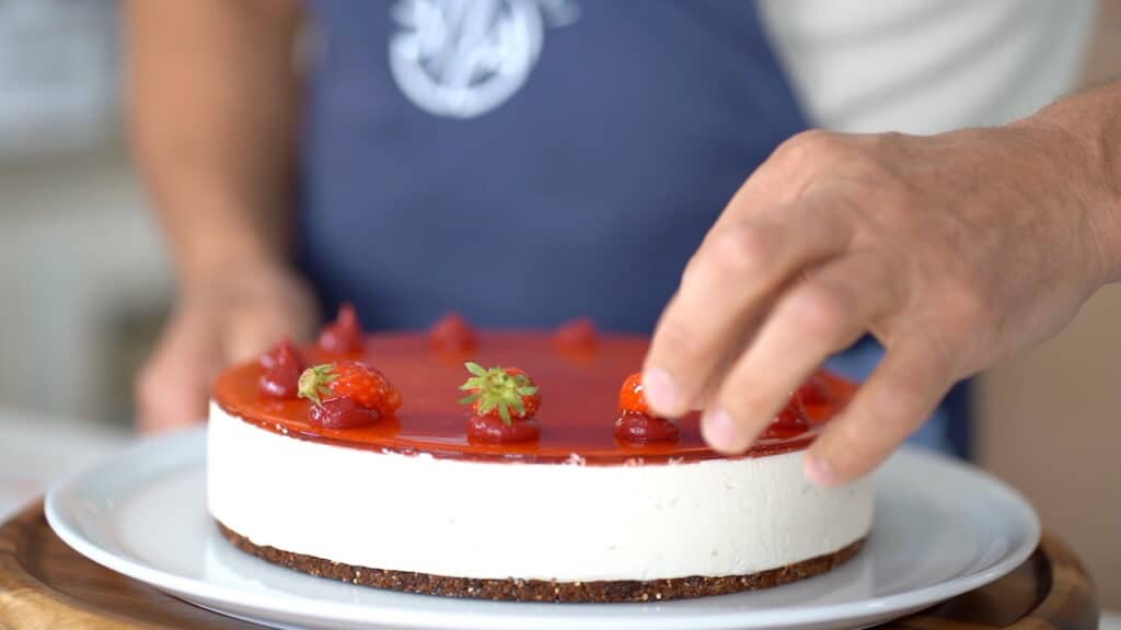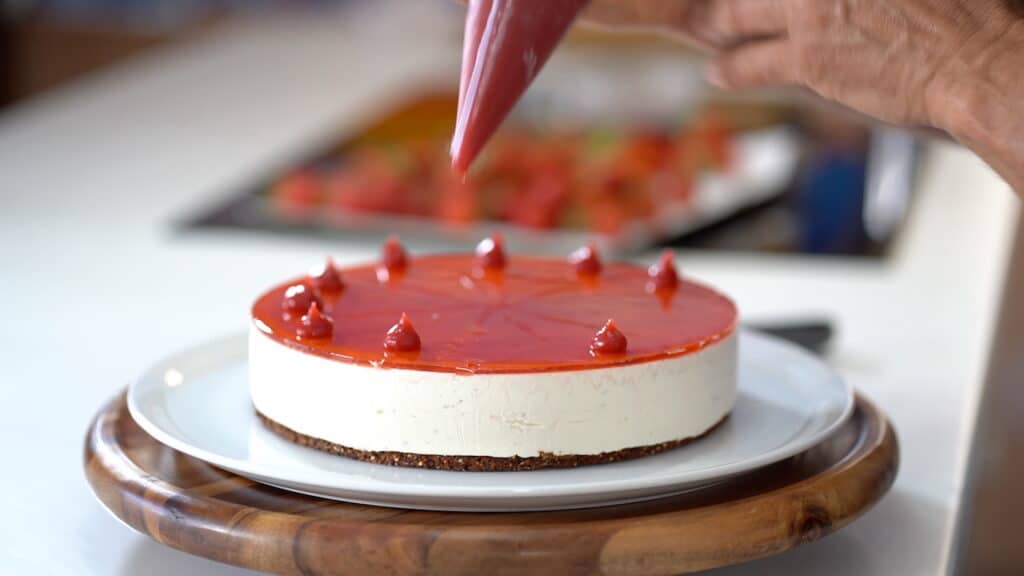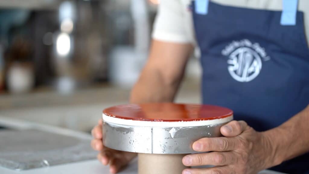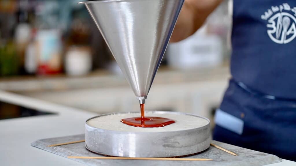 - Warm the jus de fraise glaze to 95ºF/35ºC, and glaze the cake. Freeze to set.