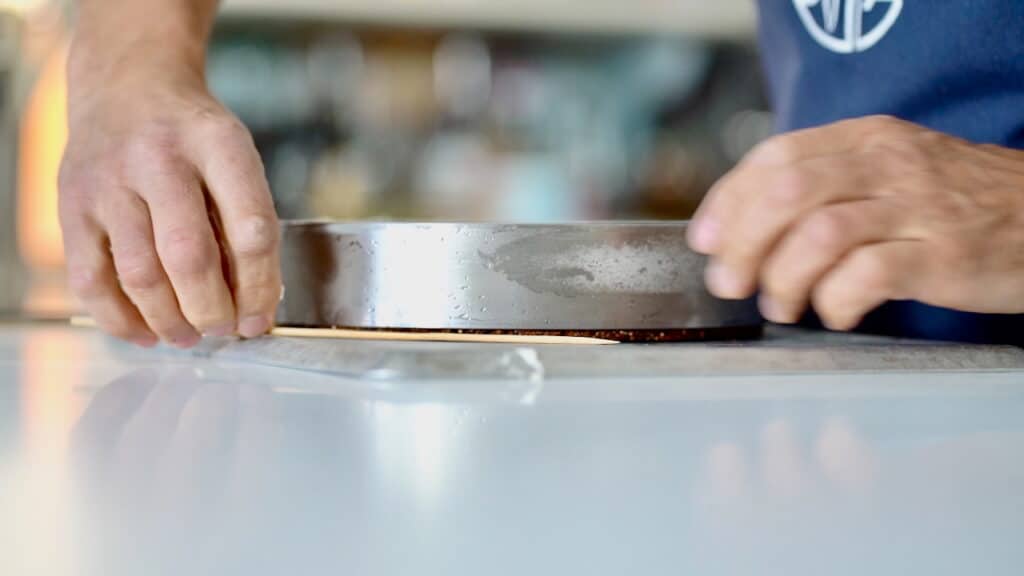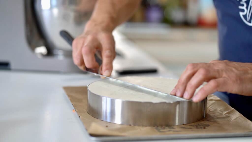 - Use a hair dryer on to warm the outer edges of the cake ring for 10–20 seconds. This loosens the cake from the ring. Slightly lift up the cake ring and slide 3 bamboo skewers under the cake. Put cake back to the freezer.
