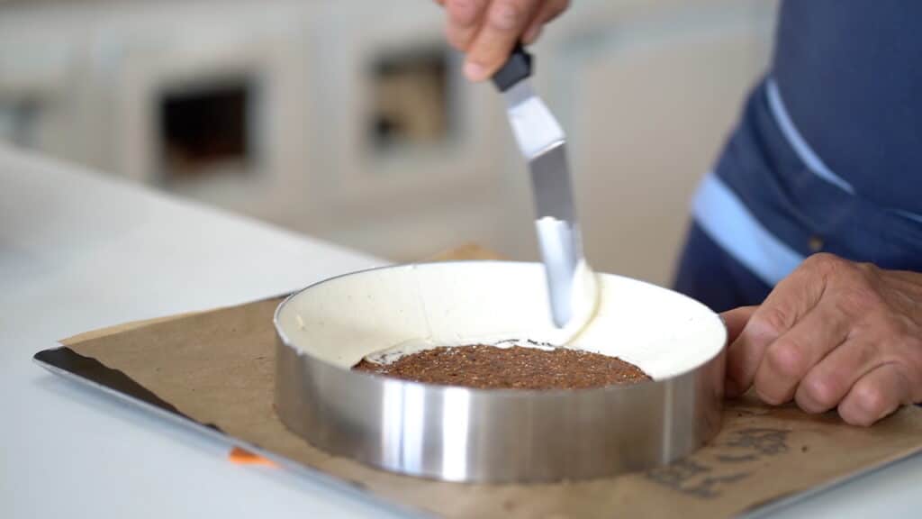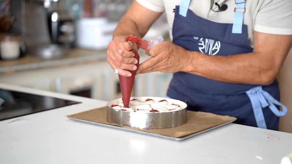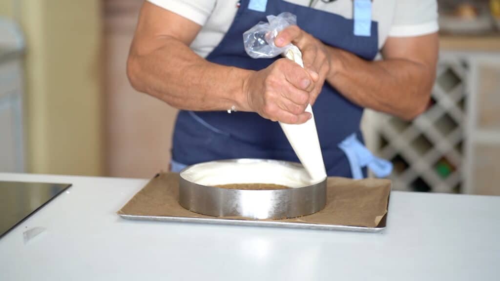 - Pipe two even, thick ropes of cream cheese filling along the inner edges of the cake ring.