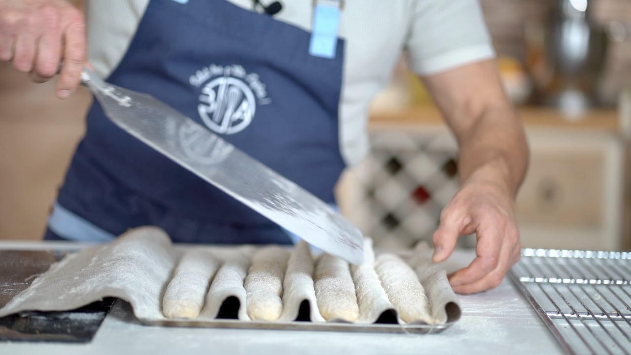 - Lightly dust the top of the proofed baguettes. Using a pizza peel, grab the corner of the couche, lift upward, and carefully flip the bread onto the edge of the peel (seam side down).