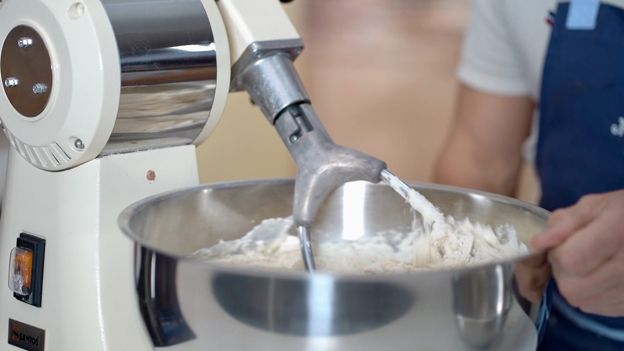 - First, pour the water into the mixing bowl and sprinkle in the fresh yeast. Add the flour and salt, then mix on low speed for 8 to 10 minutes max. Pause the mixer occasionally to scrape down the sides of the bowl and the dough hook.The dough does not need to be mixed beyond this point. We are not aiming for a fully developed dough that passes the 'windowpane test'; instead, we want the dough to be slightly under-mixed. The gluten network will develop during the bulk fermentation.