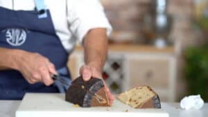 - Quarter the panettone by cutting it in half vertically and then halving each half. Slice each quarter horizontally into 3 pieces for a total of 12 slices (remove the paper mold once sliced). Note: To achieve the crispiest toast, allow the brioche slices to stale, uncovered, for 12-24 hours beforehand. This drying process is preferred for optimal texture.