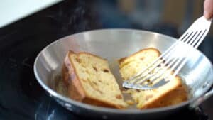 - Heat a skillet over medium heat. Add the butter. Sear the panettone slices in batches (do not overcrowd the pan) for approximately 3 minutes per side, or until each side is beautifully golden brown and crisp.