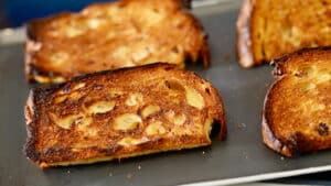 - Transfer the seared slices to a sheet tray. Repeat the process with the remaining panettone slices.
