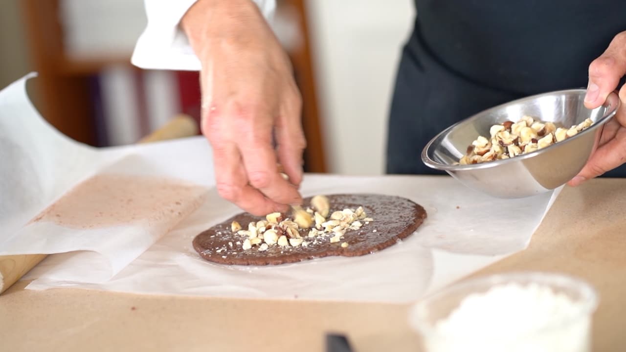- In a small bowl, lightly beat the egg white with a pinch of salt, and set aside.Divide pastry into 2 equal portions. Roll out the first crumble portion into a 0.75-inch/2cm thick round between 2 parchment papers. Brush pastry with some of the beaten egg whites. Top with half of the crushed hazelnuts (60g).