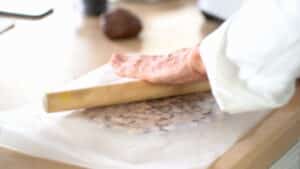 • Put parchment back on top, gently tap with the rolling pin. Roll into a 0.24-inch/6mm thick round, and freeze for 30 min. Size up crumble round into a 9.5’’/25cm diameter wheel (it should matches the size of the pate a choux wheel). Repeat with remaining crumble, and freeze.