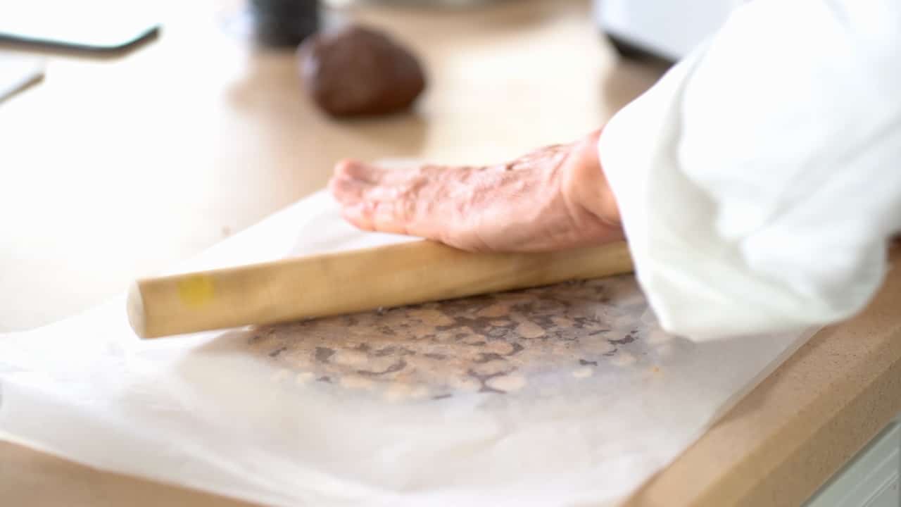 - Put parchment back on top, gently tap with the rolling pin. Roll into a 0.24-inch/6mm thick round, and freeze for 30 min. Size up crumble round into a 9.5’’/25cm diameter wheel (it should matches the size of the pate a choux wheel). Repeat with remaining crumble, and freeze.