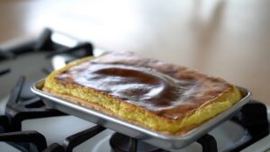 - Preheat fan oven to 375ºF/190ºC. Bake flan for 45-50minutes. Refrigerate flan overnight before cutting into desired portions.