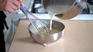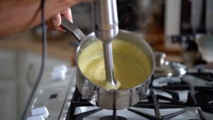 - Remove custard from the heat, and smooth it out using an immersion blender.