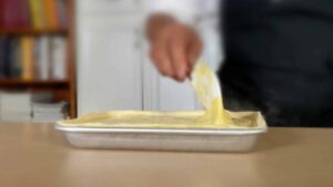 - Fill prepared pan. Let cool to room temperature before baking.