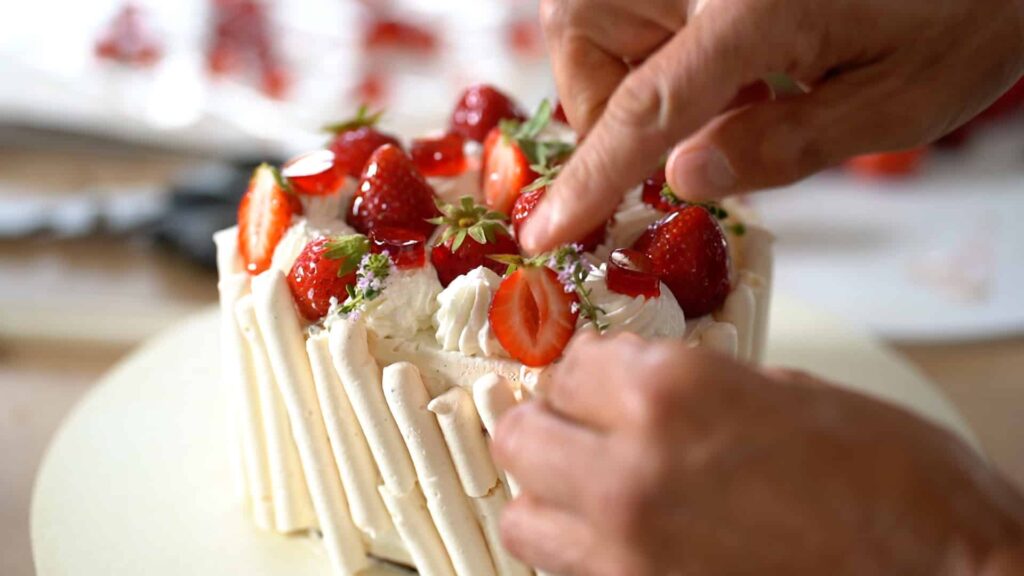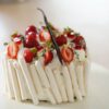 - Add more Chantilly and cover with some chopped strawberries. Spread a thin layer of Chantilly on the second meringue and flip (flat surface up).