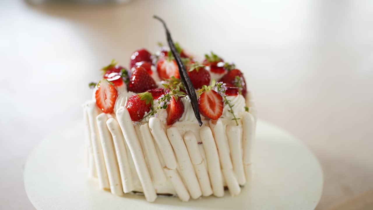 - Arrange strawberries harmoniously on cake (brush fruits with mirror neutral glaze if desired). Add jelly and edible flowers such as lemon thyme flowers.