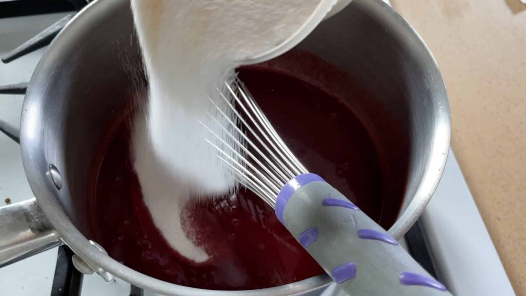 - Soak gelatin sheets in cold water to soften, and drain. In a saucepan, heat up raspberry puree with water. Mix sugar and pectin, and add it to the hot fruit puree.