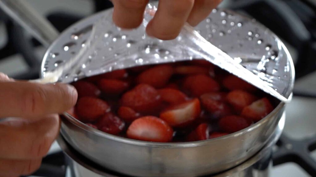 - Soak gelatin sheets in cold water to soften, and drain. Place strawberries and sugar over a bain-marie, cover with plastic wrap tight and let sweat for a couple of hours. Turn heat off and leave it to sit overnight.