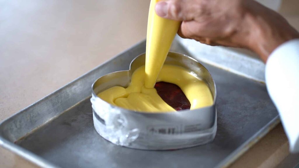 - For the inserts, prepare 2 cake rings. Seal each bottom cake ring with a stretched sheet of plastic wrap and make two 0.8 inch/2cm thick red fruit marmalade insert and freeze.