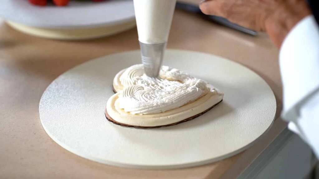- Make up 2 cake boards slightly larger than the cake with a piece of carton board. Add a dollop of Chantilly and place the first meringue disk onto it. Pipe out a layer of Chantilly.