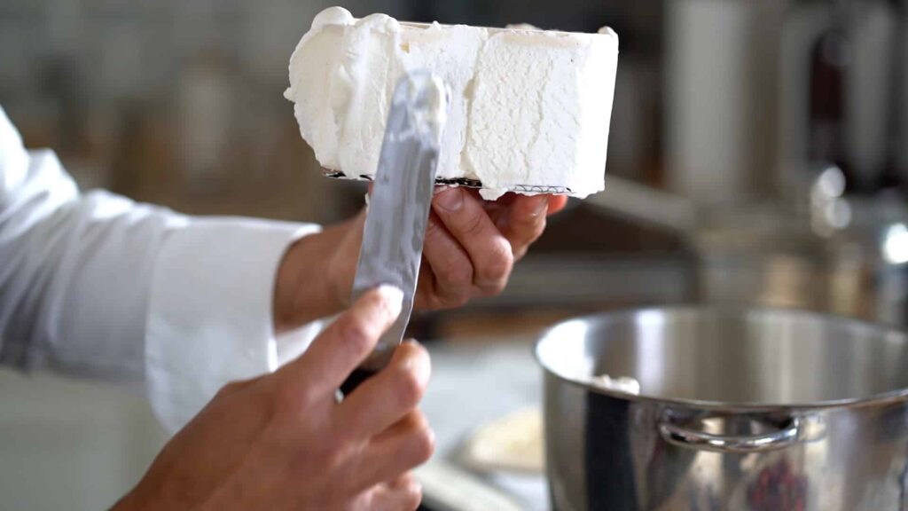 - Cover the sides of the cake with Chantilly, and even out with an offset spatula and give a neat finish to the top as well.
