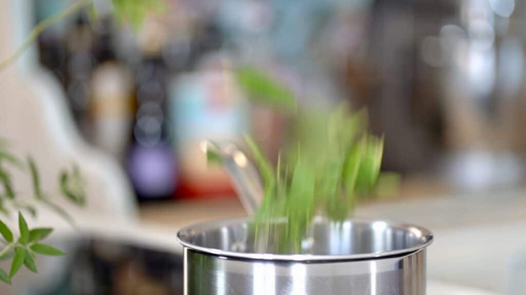 - Add the verbena leaves, liquor and cook sorbet syrup to 185ºF/85ºC, stirring constantly with the rubber spatula. Cool syrup on a ice bath, and sieve. Discard verbena leaves.