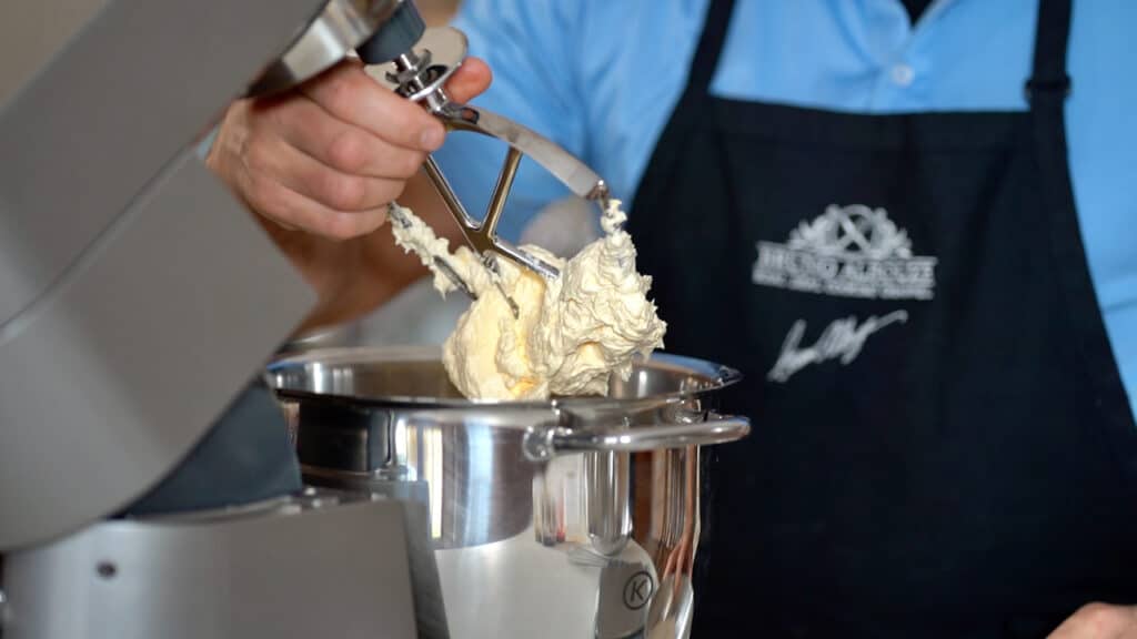 - Combine flour and baking powder; set aside. In the stand mixer fitted with the whisk attachment, beat softened butter with sugar, salt and vanilla. Add one egg and beat well until smooth. Add half of the powders and mix to combine. Do likewise with the remaining egg and flour. Then add milk and heavy cream.
