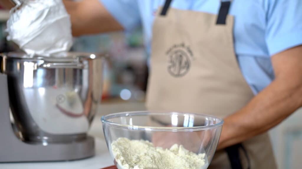 - In the stand mixer fitted with the whisk attachment, start beating egg whites with cream of tartar and one third of the sugar on medium speed. Meanwhile, in a food processor, pulse all together pistachio meal, almond, sugar and flour to fine powder. Transfer the nut-sugar mixture called tant-pour-tant in French, in large bowl.