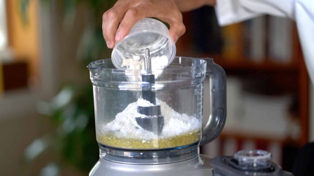 - Meanwhile, in the food processor, turn pistachio into meal. Add sugar, flour and baking powder, and mix to combine.