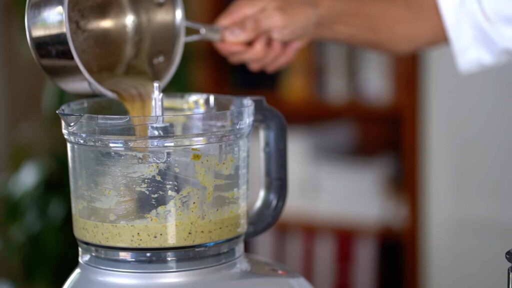 - Add egg whites and give a few pulses. Then add pistachio paste and warm brown butter. Refrigerate batter until ready to use.