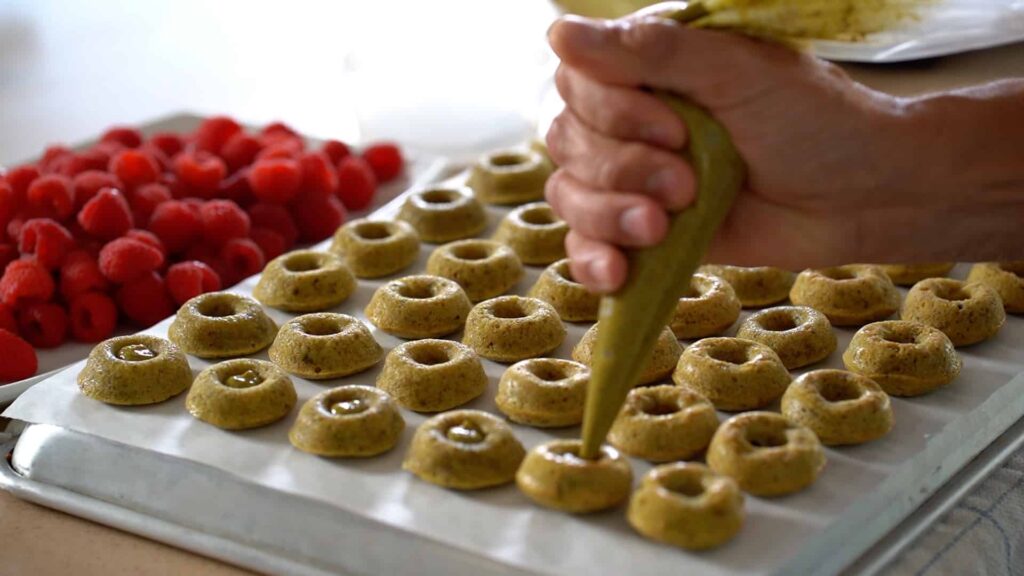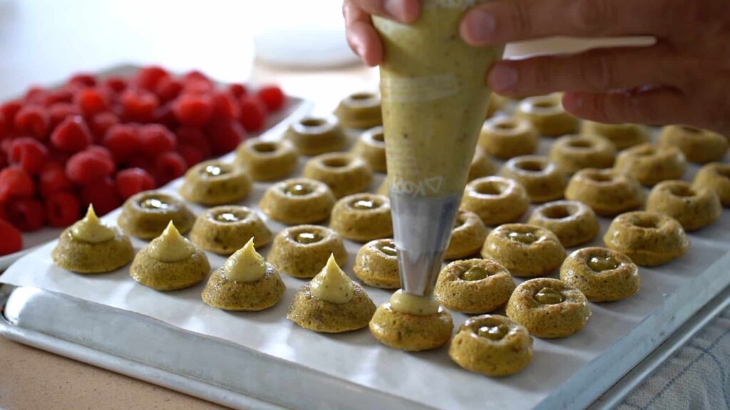 - Fill petits fours with pistachio paste