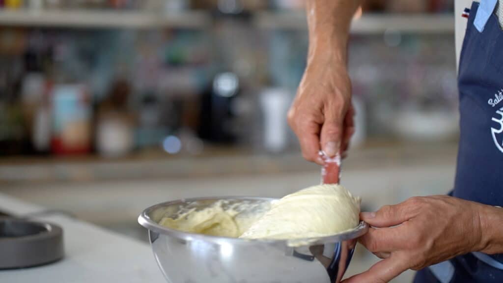 - Fold a third of the meringue into the batter. Then incorporate remaining meringue.