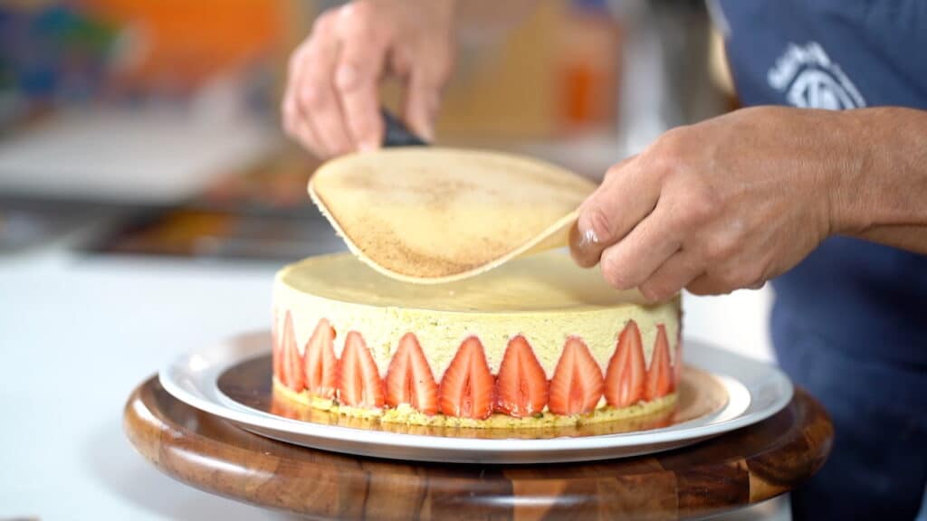 - Pipe out pistachio mousseline from bottom to top between each strawberry. Cover bottom sponge as well.